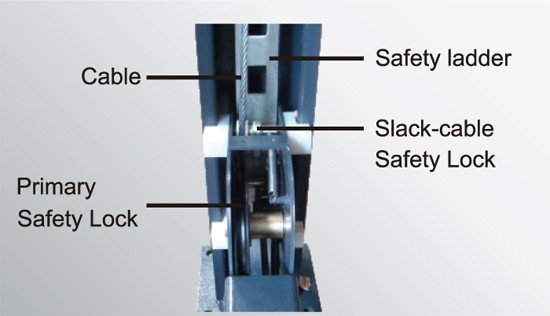 Features a redundant safety system designed for long-term storage. A spring-loaded, multi-position locking mechanism automatically engages at every ladder rung as the lift rises. Crucially, it includes a secondary Slack-Cable Safety System that acts as an emergency backup, instantly locking the runways in place if a cable were ever to go slack or fail. This dual-redundant design provides complete peace of mind.