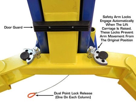 Safety is automatic. The carriage-locking system engages at multiple height intervals, allowing you to work safely at the most comfortable elevation. Designed with automatic arm restraints that lock the vehicle’s position once lifted, and a secure manual release system (single or dual-point depending on the specific model configuration) that keeps the operator in control during descent.