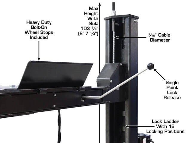 Built to handle heavy-duty cycles, the frame is constructed from high-tensile, heavy-gauge steel. The entire structure is finished with a durable, weather-resistant powder coating that resists rust, chemicals, and chipping far better than standard paint. All cables, sheaves, and chains are rated to exceed the lift’s maximum capacity, ensuring a safety factor well above industry requirements.