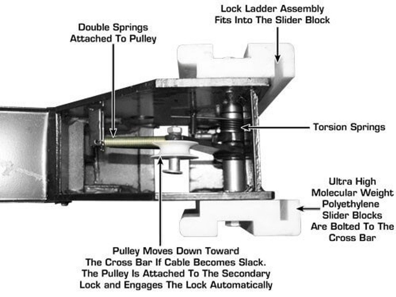 Features a redundant safety system designed for long-term storage. A spring-loaded, multi-position locking mechanism automatically engages at every ladder rung as the lift rises. Crucially, it includes a secondary Slack-Cable Safety System that acts as an emergency backup, instantly locking the runways in place if a cable were ever to go slack or fail. This dual-redundant design provides complete peace of mind.