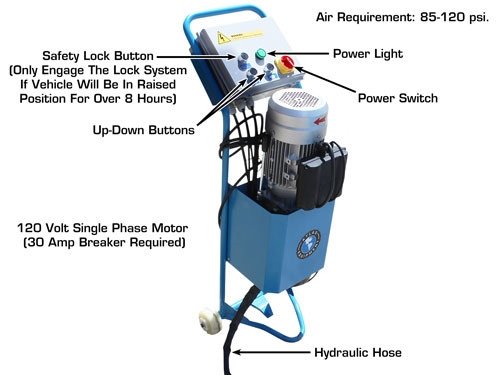 Equipped with a commercial-grade hydraulic cylinder concealed securely under the runway for maximum protection. The system features an integrated flow restrictor (velocity fuse) that ensures a smooth, controlled descent even in the unlikely event of a hose rupture. The electric-hydraulic power unit delivers consistent lifting power, achieving full rise in approximately 45–60 seconds depending on the weight load.