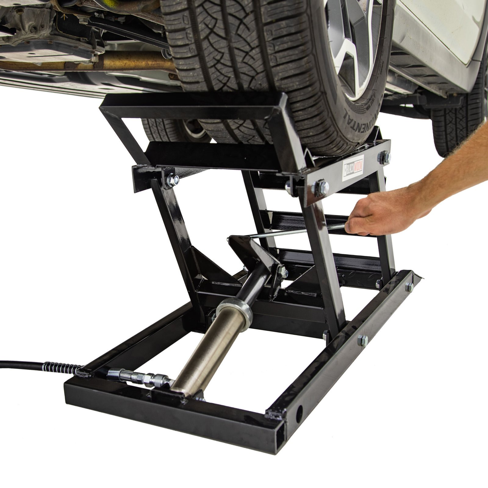 The Black Widow CLL-BW-001 is a 0-lb capacity scissor/low-rise lift designed for quick wheel service and alignment work. Scissor lifts require minimal ceiling height and are portable, making them perfect for home garages or mobile service operations.