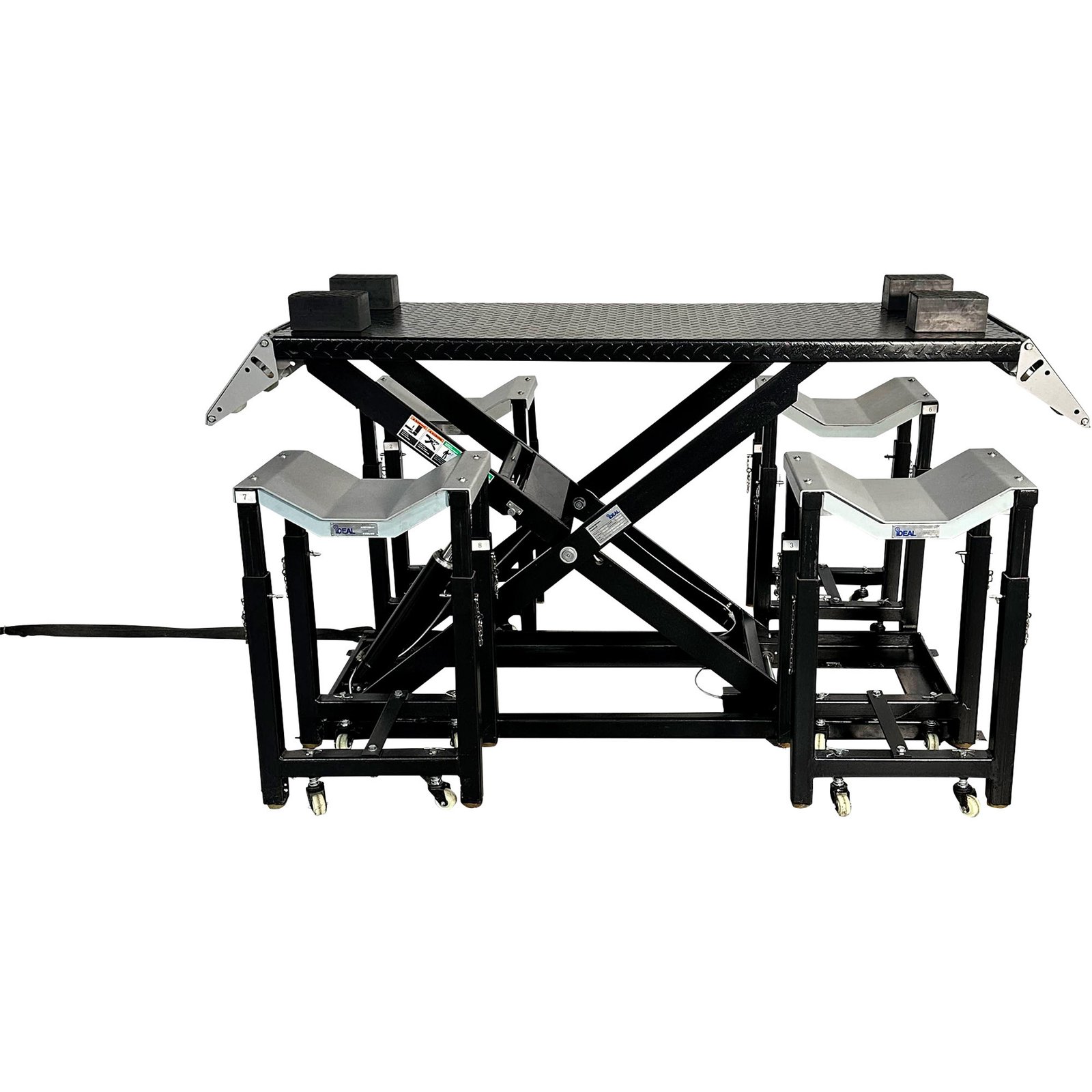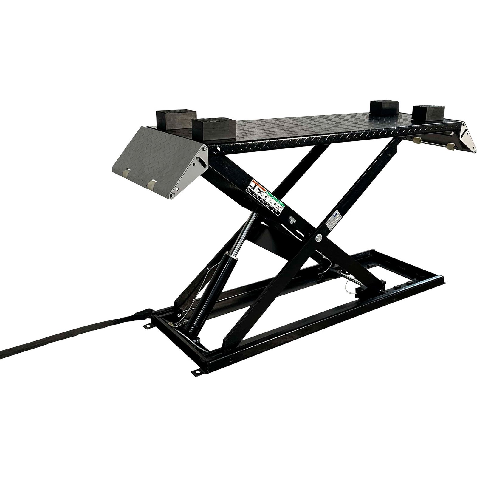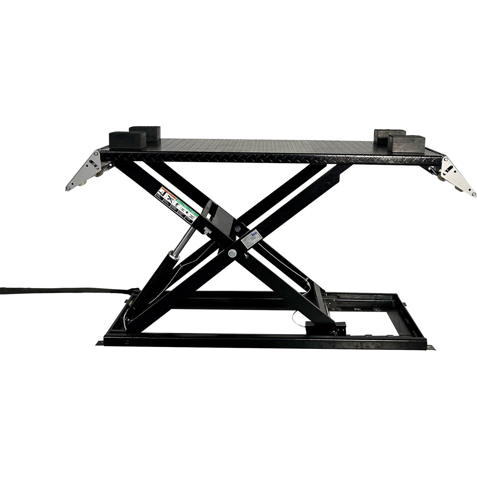 The iDEAL UF-2500EH-X-BLK is a 2,500-lb capacity scissor/low-rise lift designed for quick wheel service and alignment work. Scissor lifts require minimal ceiling height and are portable, making them perfect for home garages or mobile service operations.