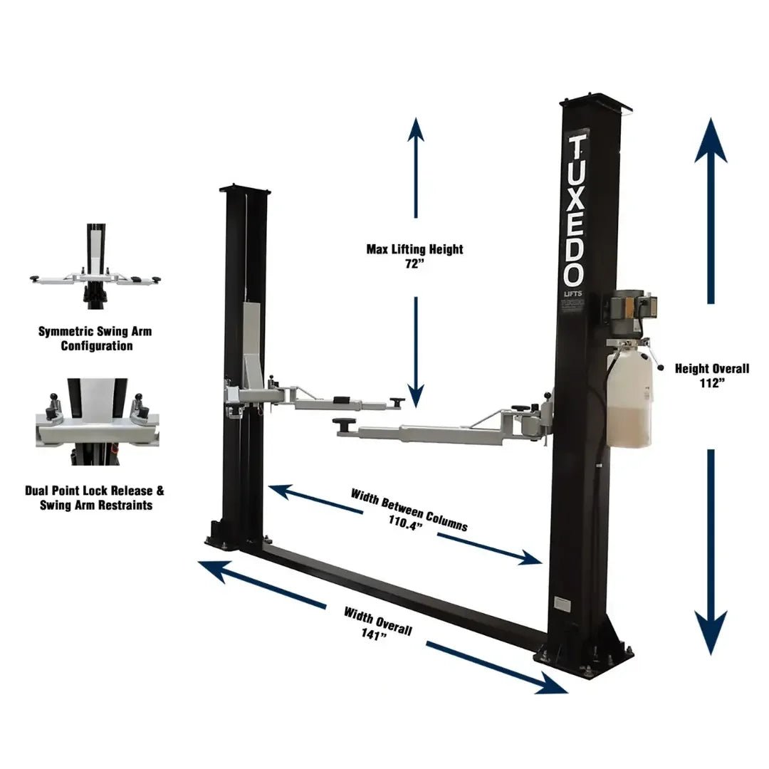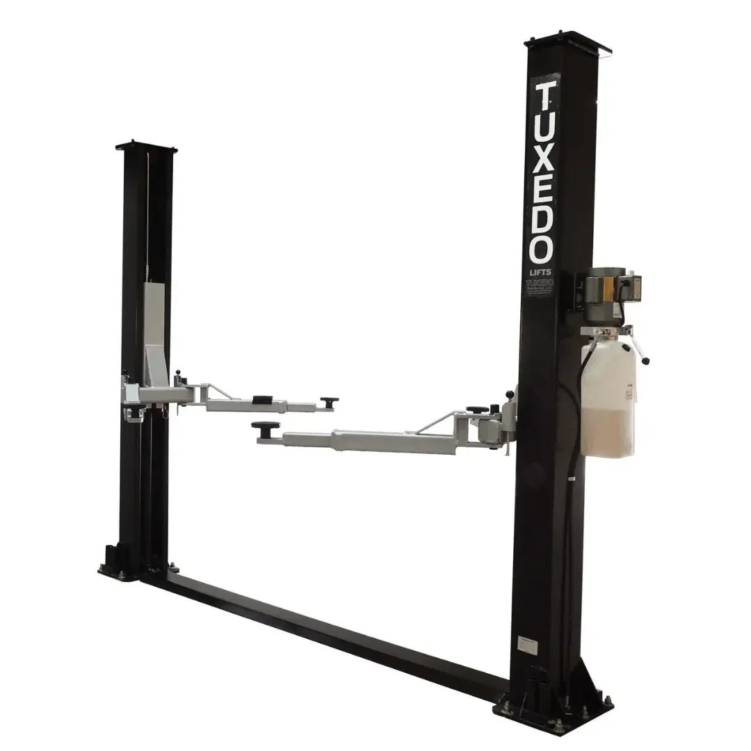 The Tuxedo VP9KF-TUX is a 9,000-lb capacity 2-post lift designed for professional-grade vehicle service. 2-post lifts provide full undercarriage access for suspension, brake, and exhaust work. This is the standard lift type found in professional auto shops worldwide.