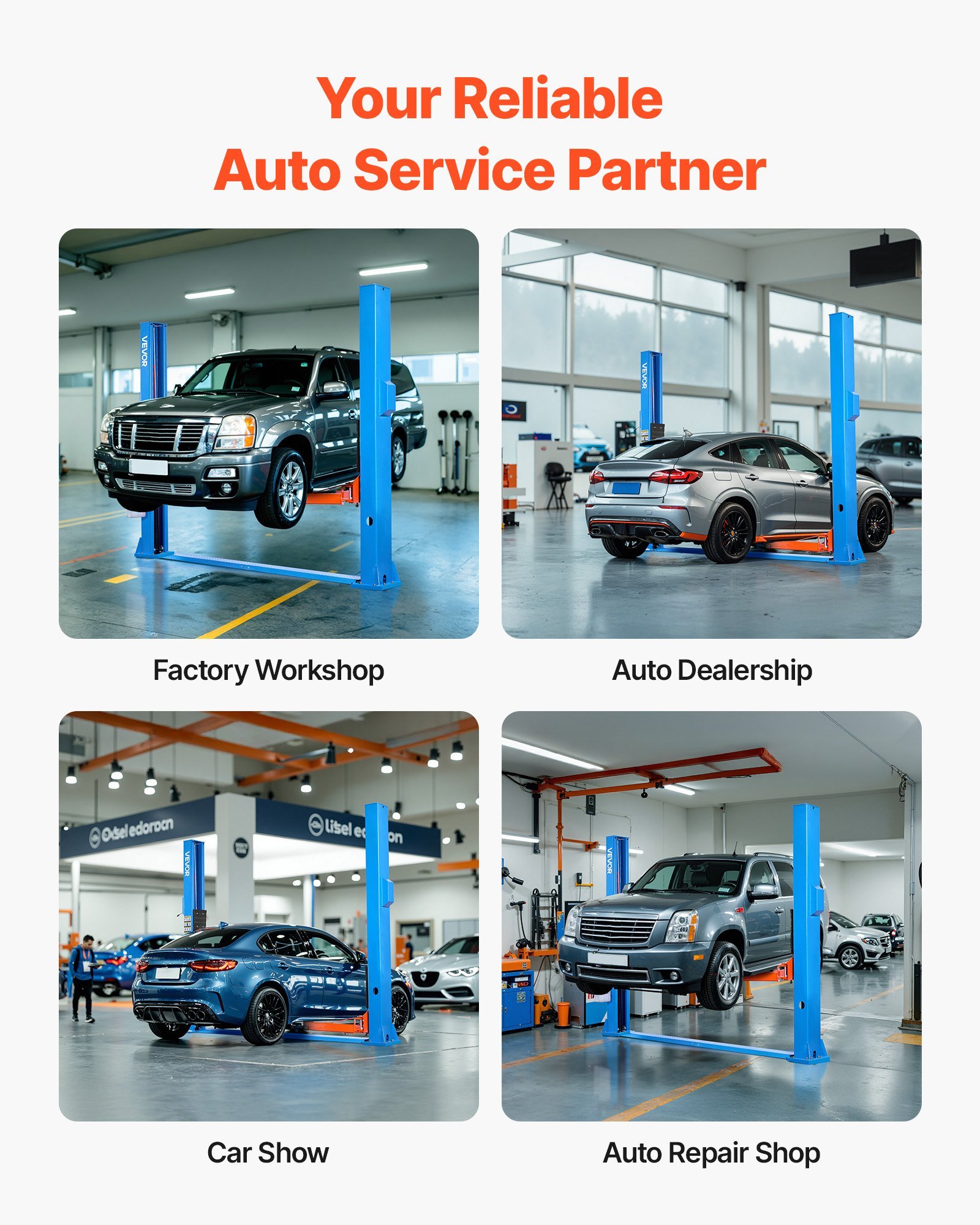 The VEVOR VEVOR_JTL5000BM_12000LBS is a 12,000-lb capacity 2-post lift designed for professional-grade vehicle service. 2-post lifts provide full undercarriage access for suspension, brake, and exhaust work. This is the standard lift type found in professional auto shops worldwide.